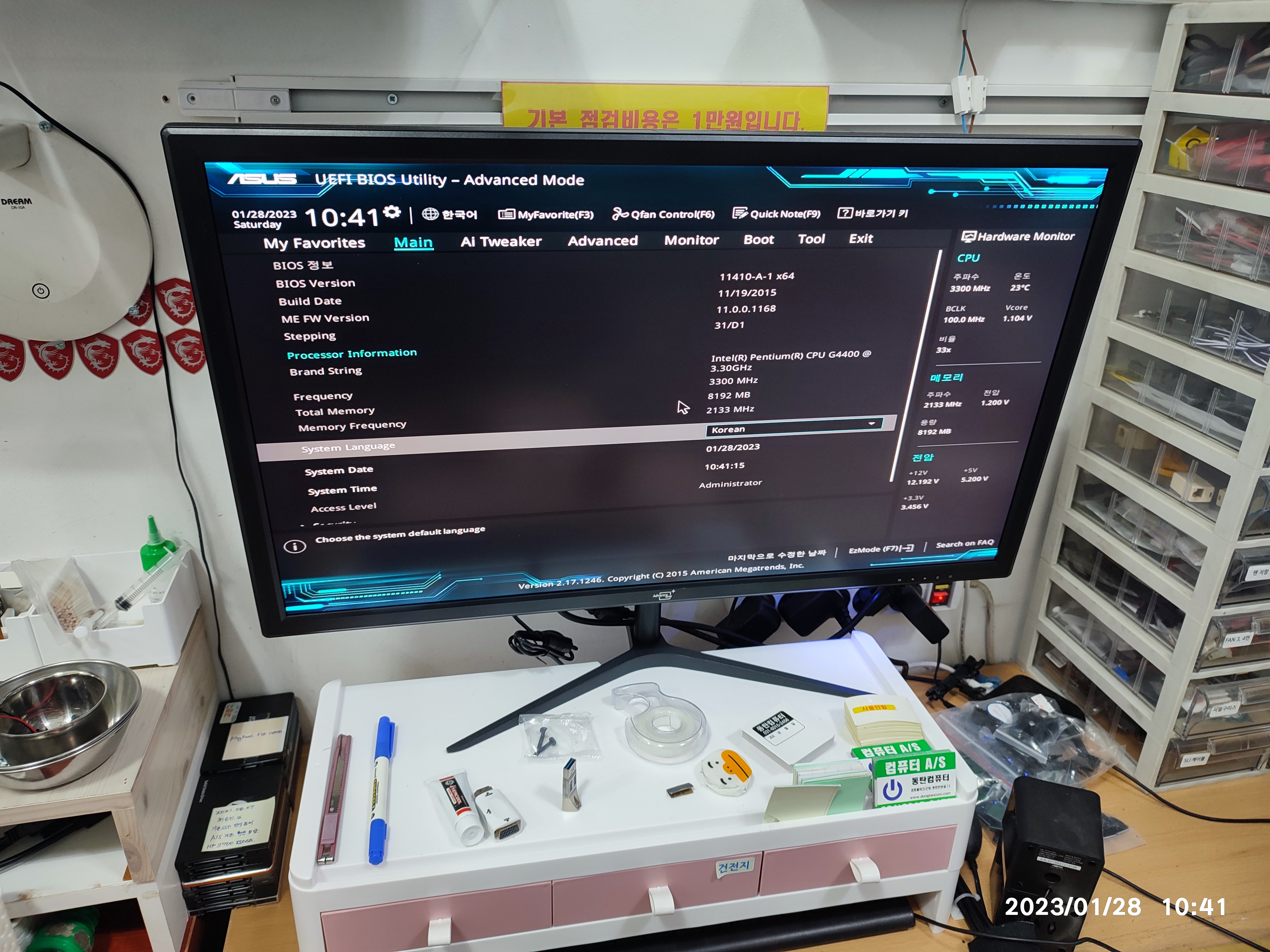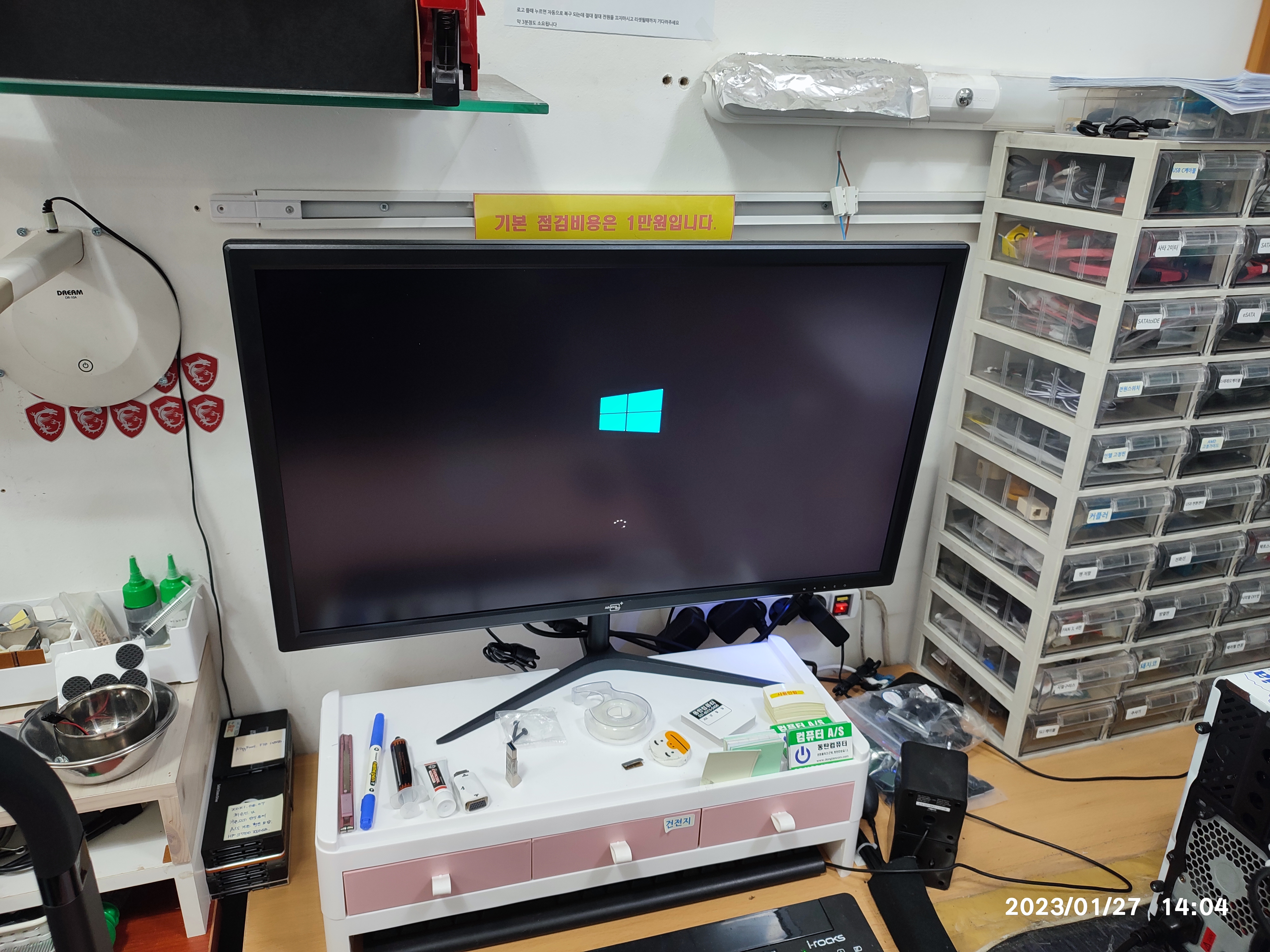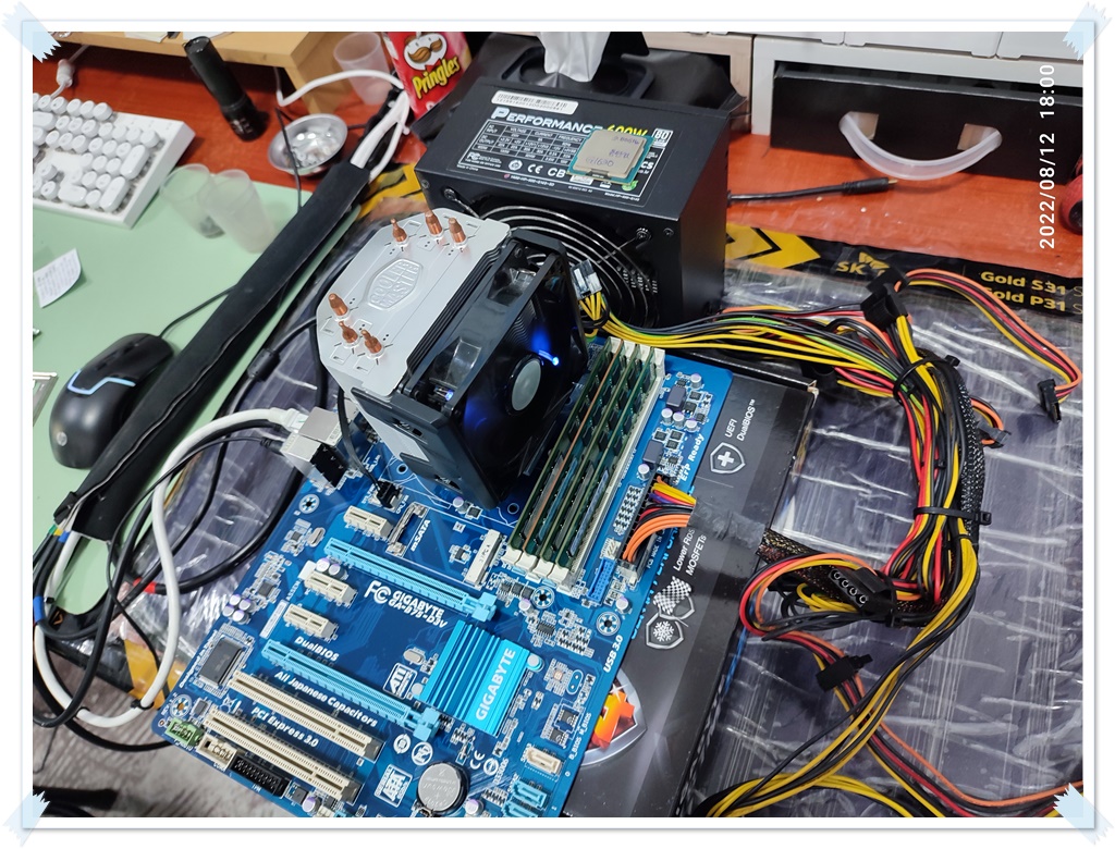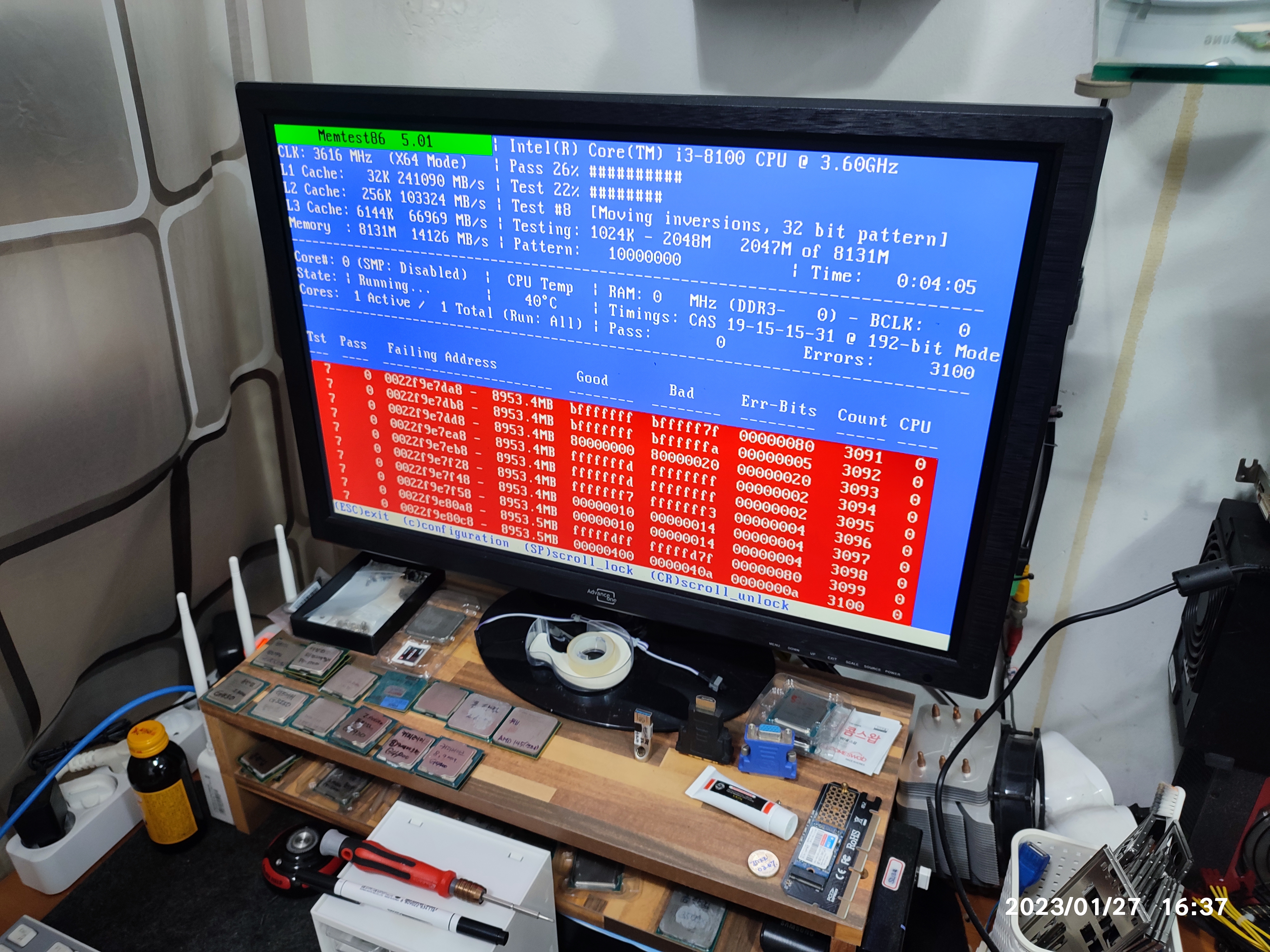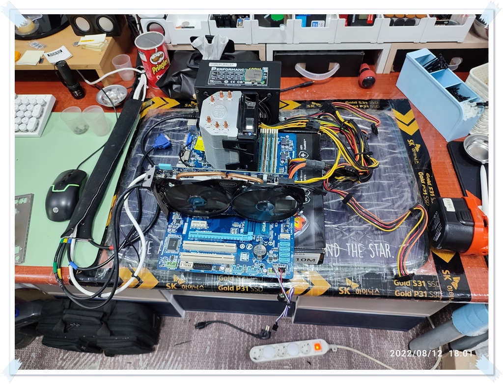 아래는 제 테스트용 메인보드입니다. 제 CPU와 메모리, 파워서플라이 등으로 테스트해서 잘 되는 걸 확인하고 분류해둔 테스트용 메인보드입니다. 손님의 CPU와 메모리, 그래픽카드 등의 호환성이 있는 메인보드입니다. 일단은 제 부품을 다시 연결해서, 메인보드가 정상적으로 동작하는지, 손님 부품을 장착하기 전에 제 메인보드의 상태를 다시 확인합니다. 테스트하고 보관하고 있었을 뿐인데도, 세월이 지나면, 갑작스럽게 동작을 멈추는 (고장나는) 보드도 있기 때문에, 손님 부속을 테스트하기전에 먼저 상태 점검해보고 교차 테스트 진행합니다. 손님과 같이 확인한다고 테스트 과정은 사진상으로 남기진 못했네요. 제 보드는 정상적으로 바이오스 화면까지 진입됩니다. (윈도우 화면까지는 넘어가지 않았습니다. 그렇게 확인하는 게 더 정확하지만, 시간이 오래 걸립니다.)