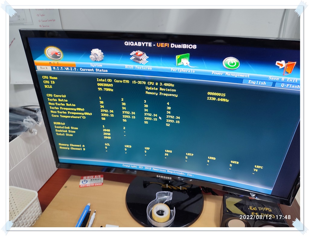 제 메인보드에 (네임펜으로 성함을 적어둔) 손님의 CPU를 장착했습니다. UEFI DUalBIOS 화면에서 손님의 CPU i5-3570이 정상적으로 인식되는 걸 확인했습니다. CPU, RAM, 그래픽카드 등 탈부착 가능한 부속은 전부 테스트를 했습니다. 정상적으로 화면이 출력됩니다.