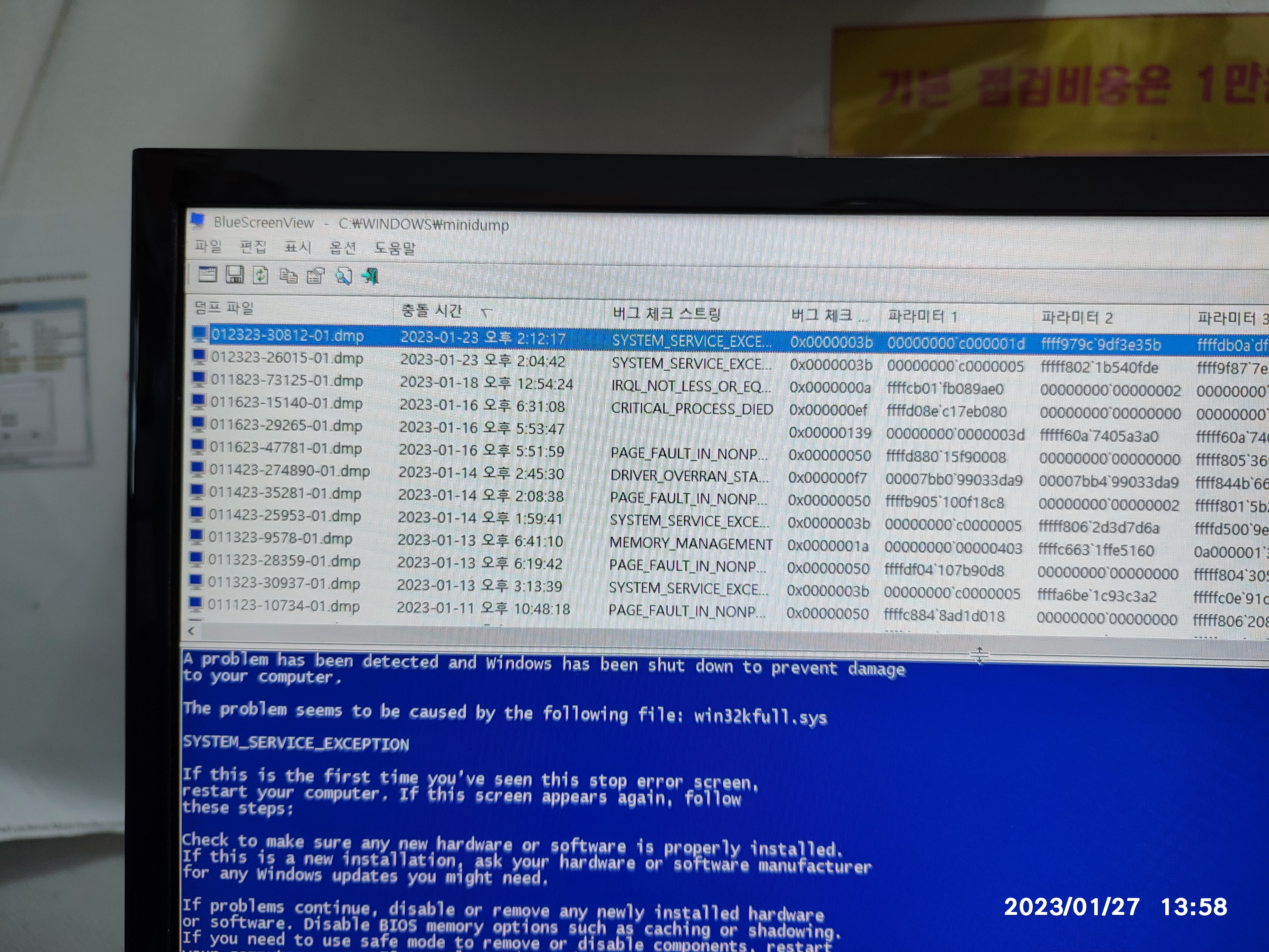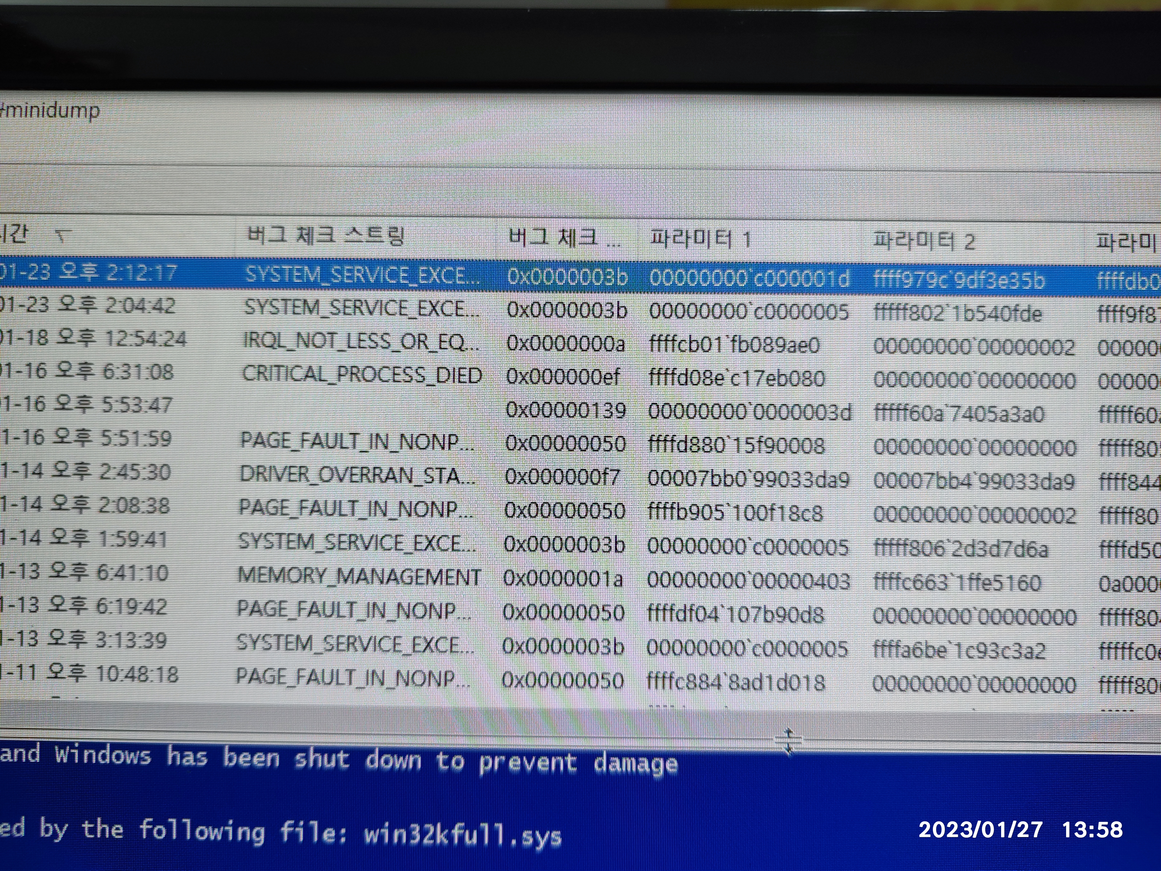 강제 종료가 많이 생겨서 그런지 부팅하면, 위와 같이 디스크 체크가 실행됩니다. 윈도우 켜지고 블루스크린 뷰어로 기존의 블루스크린 종류를 확인해보고 있습니다. 오류 코드가 일정하지 않고 중구난방입니다. 그래서, 일단 컴퓨터를 사용해보시라고 권해드렸는데요. 저희 매장에서는 컴퓨터가 꺼지질 않았습니다. 사용할 때는 컴퓨터가 느린 증상 외에는 별다른 문제는 없었는데, 마지막으로 종료하는 순간에 블루스크린이 한 번 떴습니다.